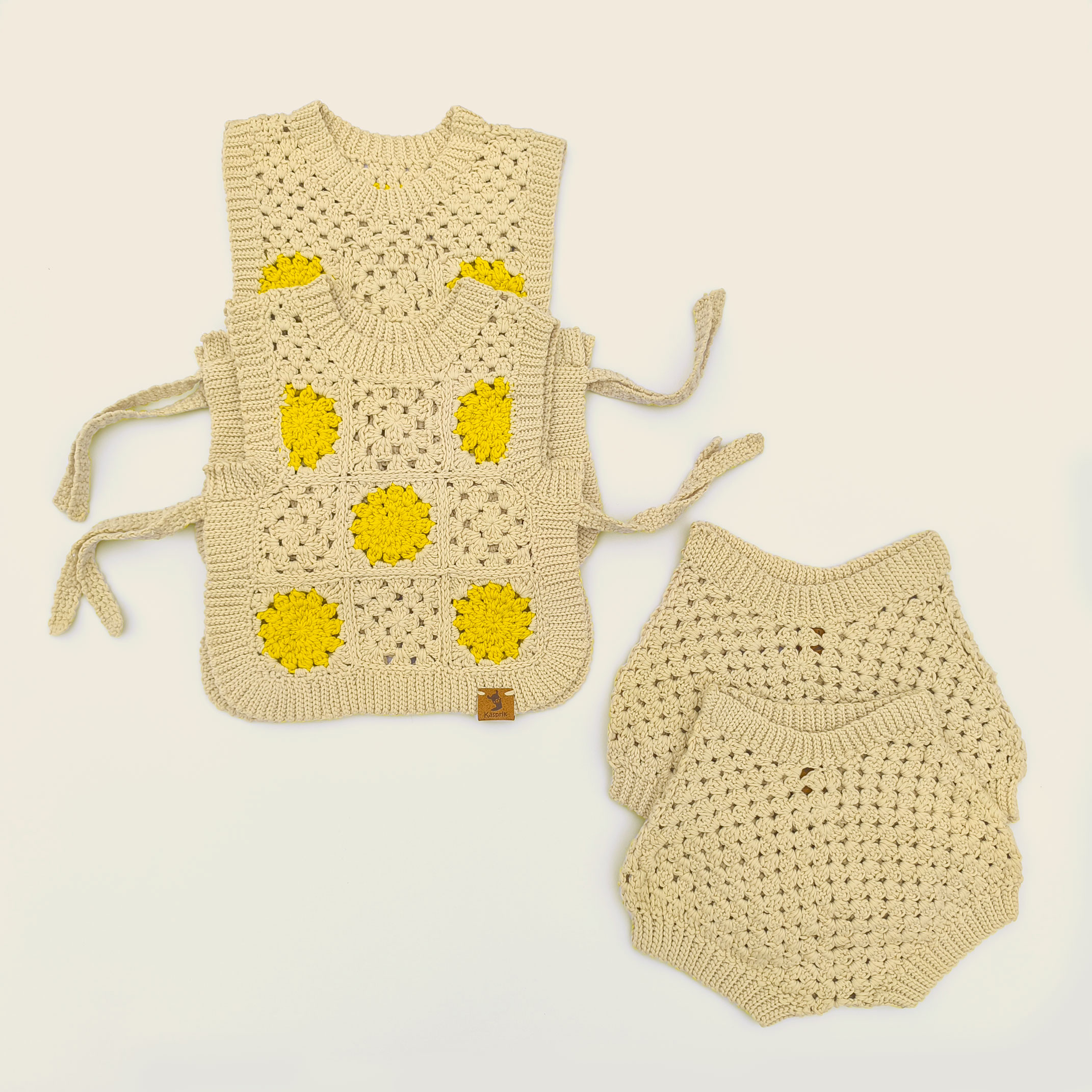 Hecho a mano en 100% algodón con la clásica puntada granny y detalles de soles en intarsia, este conjunto tiene esa suavidad especial que solo logran los materiales nobles y el trabajo cuidadoso—con un calce ligero y fresco, perfecto para los días de verano. El chalequito se puede usar solo o sobre un body, y las bombachitas completan el look con un toque dulce y funcional. Es ese conjunto veraniego que no sabías que necesitabas.